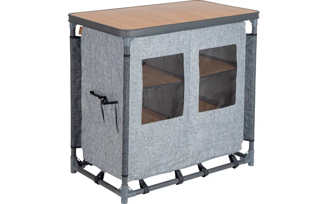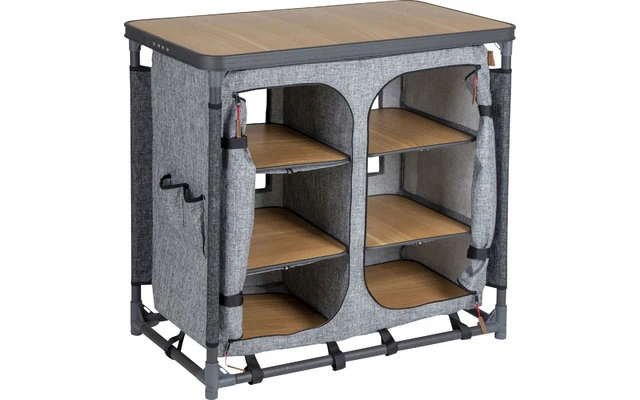 Eine stilvoller und luxuriöser Küchenschrank. Ausgestattet mit einem extra robusten Bezug aus hochwertigem 600D Oxford Polyester in Leinenoptik, der 6 nützliche Einlegeböden und 4 Seitentaschen enthält, sowie einer mitteldichte Hartfaserplatte mit Holzdekor. Die Beine sind individuell verstellbar und sorgen für hohe Stabilität auf jedem Untergrund. Der Küchenschrank wird in einer Tragetasche geliefert.